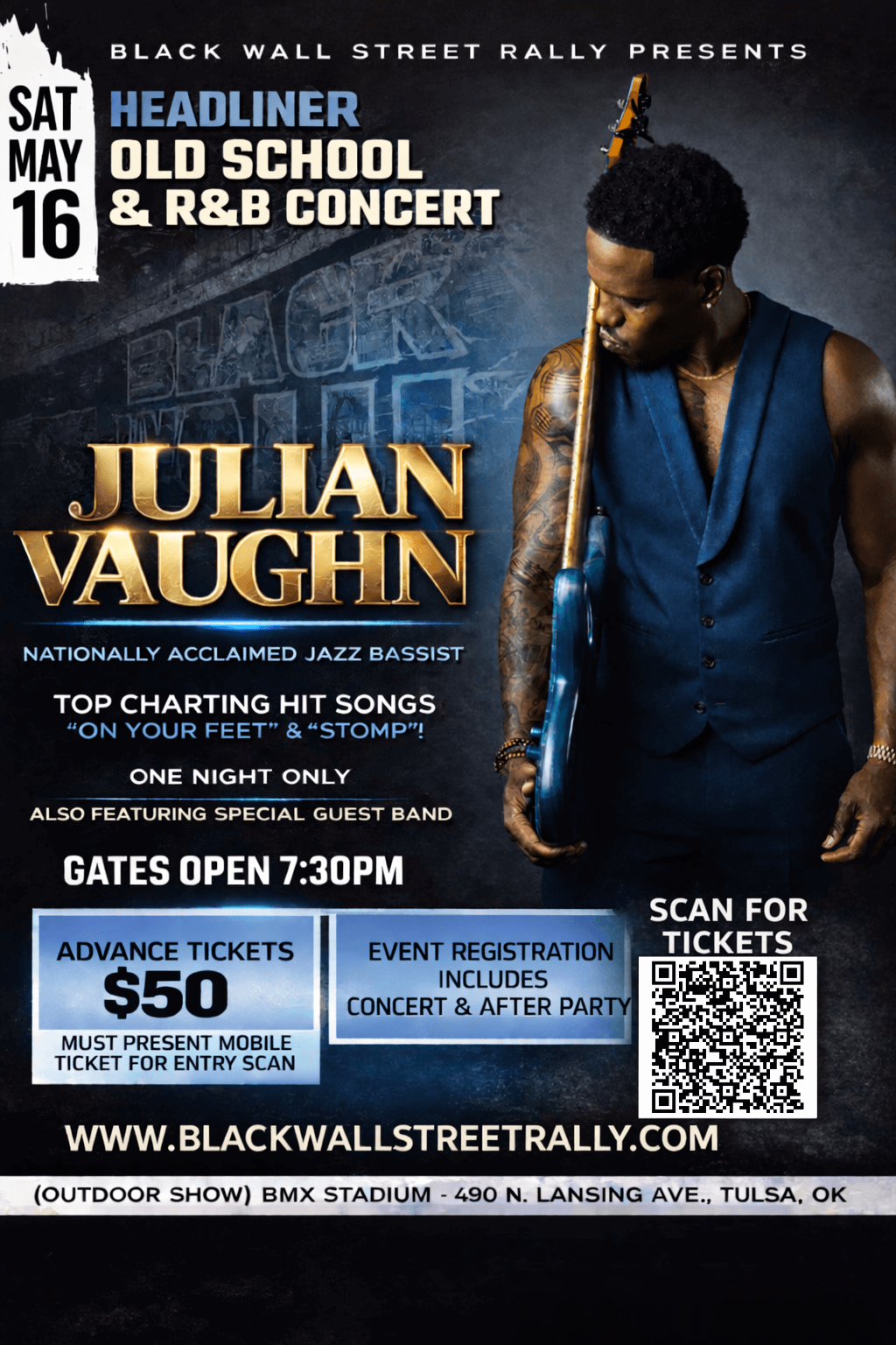 TULSA, OK — Music lovers in Tulsa are in for an unforgettable night as the Black Wall Street Rally presents an Old School & R&B Concert headlined by nationally acclaimed jazz bassist Julian Vaughn on Saturday, May 16, at BMX Stadium.